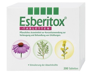 Esberitox Tabletten sind ein pflanzliches Arzneimittel zur unterstützenden Behand-lung von Erkältungskrankheiten sowie zur Vorbeugung von häufig wiederkehrenden Erkältungen. Wie sind Esberitox Tabletten einzunehmen? Erwachsene und Jugendliche ab 12 Jahren: 3-mal täglich 3 TablettenKinder von 7-11 Jahren: 3-mal täglich 2 TablettenKinder von 4-6 Jahren: 3-mal täglich 1 TabletteKinder unter 4 Jahren: Die Anwendung bei Kindern unter 4 Jahren wird nicht empfohlen, da keine ausreichenden Daten vorliegen.Morgens, mittags und abends mit etwas Flüssigkeit einnehmen oder im Mund zergehen lassen.Die Behandlung sollte bei den ersten Zeichen einer Erkältung begonnen werden.Wenn sich die Beschwerden verschlimmern oder länger als 10 Tage andauern, muss ein Arzt aufgesucht werden.Esberitox Tabletten dürfen ohne Unterbrechung nicht länger als 8 Wochen einge-nommen werden. Was Esberitox-Tabletten enthalten Die Wirkstoffe sind:1 Tablette enthält 3,2 mg Trockenextrakt (Droge-Extrakt-Verhältnis 4-9:1) aus einer Mischung von Färberhülsenwurzelstock (Baptisiae rhizoma), Purpursonnenhutwurzel (Echinaceae purpureae radix), Blassfarbener Sonnenhutwurzel (Echinaceae pallidae radix) und Lebensbaumspitzen und -blättern (Thujae occidentalis herba) im Verhältnis 4,92:1,85:1,85:1. Auszugsmittel: Ethanol 30% (V/V)Die sonstigen Bestandteile sind:Lactose, Magnesiumstearat, Macrogol, SaccharoseGebrauchsinformation: Esberitox Tabletten 200 St Nebenwirkungen, Wechselwirkungen und sonstige wichtige Informationen: siehe Gebrauchsinformation
