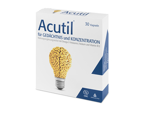 Immer mehr Menschen sind in der heutigen hektischen Zeit steigenden geistigen Belastungen ausgesetzt. Wenn da der körpereigene Stoffwechsel und die Erholungsphasen nicht mehr ausreichen, um die vollständige Leistung des Gehirns aufrecht zu erhalten, kann die Zufuhr von vitalisierenden Stoffen einen Ausgleich schaffen.Acutil® ist ein innovatives Kombinationspräparat zur Nahrungsergänzung. Acutil® hilft älteren Menschen und Personen, die unter erhöhter geistiger Beanspruchung (z.B. Stress) stehen bzw. unter den Zeichen des Alterungsprozess des Gehirns leiden, die kognitiven Funktionen (z.B. Merkfähigkeit) zu erhalten bzw. zu verbessern.Fischöl Omega-3 Fettsäuren Docosahexaensäure (DHA)** Eicosapentaensäure (EPA)**500 mg350 mg250 mg40 mg Ginkgo Biloba Extrakt60 mg Phosphatidylserin15 mg Vitamin E5 mg Folsäure250µg Vitamin B125 µg Nebenwirkungen, Wechselwirkungen und sonstige wichtige Informationen: siehe Gebrauchsinformation / FolderGebrauchsinformation / Folder Acutil