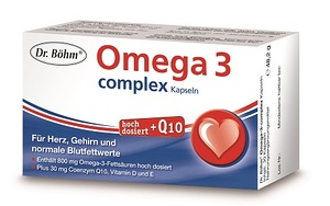 Für Herz, Gehirn und normale BlutfettwerteEnthält 800 mg Omega-3-Fettsäuren hoch dosiertPlus 30 mg Coenzym Q10, Vitamin D und EOmega-3-Fettsäuren – warum sind sie gut für uns? Omega-3-Fettsäuren gehören zu den lebensnotwendigen Fettsäuren, sind Bestandteile der Zellmembranen und wichtige Bausteine für Botenstoffe im Körper. Besonders für das Herz spielen sie eine Rolle und tragen zu dessen gesunder Funktion bei. Darüber hinaus unterstützen sie ein normal funktionierendes Gehirn. Schon vor der Geburt, aber ebenso im Kindes- und Erwachsenenalter, brauchen die Zellen in unserem Denkorgan viel Omega-3.Auch zu normalen Blutfettwerten (Triglyceriden) leisten diese ungesättigten Fettsäuren einen wertvollen Beitrag. Das ist eine wichtige Eigenschaft, denn die negativen Folgen zu hoher Blutfettwerte auf das Herz- und Gefäßsystem sind gut erforscht und allseits bekannt. Obwohl sie essenziell, also lebensnotwendig sind, kann der Körper Omega-3-Fettsäuren nicht selbst bilden und ist daher auf eine Zufuhr von außen angewiesen.Umfassend versorgt: Omega-3 plus Coenzym Q10, Vitamin D und EDr. Böhm® Omega-3-complex Kapseln enthalten:Geprüftes, hoch konzentriertes Kaltwasserfischöl. Es liefert schadstoffgeprüfte, wichtige Omega-3-Fettsäuren wie Eicosapentaen- und Docosahexaensäure (EPA, DHA) in hoher Dosierung (800 mg).Coenzym Q10. Mit 30 mg optimal dosiert. Coenzym Q10 ist eine sinnvolle Ergänzung, denn es kommt in den Mitochondrien, den „Kraftwerken“ unserer Zellen vor. Hohe Konzentrationen an Q10 fi nden sich in besonders aktiven Organen und Geweben (wie in Herz, Muskeln, Leber oder Nieren). Mit zunehmendem Alter nimmt die Fähigkeit des Körpers, das lebenswichtige Q10 selbst zu bilden, immer mehr ab.Vitamin D. Das Multitalent unter den Vitaminen trägt unter anderem zu einem funktionierenden Immunsystem bei. Es wird auch „Sonnenvitamin“ genannt, weil es bei ausreichender Sonneneinstrahlung selbst gebildet werden kann. Das Problem: In unseren Breiten reicht die UV-Strahlung von Oktober bis März oft nicht aus, um genügend Vitamin D zu bilden.Natürliches Vitamin E. Es bewahrt die empfindlichen Fettsäuren vor schädlicher Oxidation und trägt im Körper zum Schutz der Zellen vor oxidativem Stress bei.Zutaten: Kaltwasserfi schöl, Gelatine, Feuchthaltemittel Glycerin, Coenzym Q10, DL- -Tocopherylacetat, Farbstoff Eisenoxide und -hydroxide, Cholecalciferol.Dosierung und Anwendung von Dr. Böhm® Omega-3-complex Kapseln: Täglich 1 bis 3 Kapseln unzerkaut mit etwas Flüssigkeit am besten zu den Mahlzeiten einnehmen. Die empfohlene Tagesdosis nicht überschreiten.Frei von Lactose, Hefe, Gluten, künstlichen Azofarbstoffen und Konservierungsmitteln.Auch im Rahmen einer Jod-reduzierten Ernährung geeignet.Enthält hoch gereinigtes, konzentriertes und schadstoffgeprüftes Fischöl aus kleinen Kaltwasserfischen.Geruchs- und geschmacksfrei durch verzögerte Freisetzung der Wirkstoffe.1 Kapsel enthält 0,01 BE.Gebrauchsinformation: Dr. Böhm® Omega-3-complex Kapseln Nebenwirkungen, Wechselwirkungen und sonstige wichtige Informationen: siehe Gebrauchsinformation