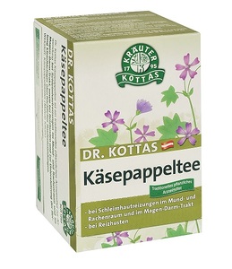 Dr. Kottas Käsepappeltee ist ein traditionelles pflanzliches Arzneimittel zur Anwendung bei Schleimhautreizungen im Mund- und Rachenraum und im Magen-Darm-Trakt, sowie bei Reizhusten und zur Unterstützung der Heilung kleinflächiger oberflächlicher Hautentzündungen.Wirkstoff: Käsepappelblätter (Malvae folium)ART DER ANWENDUNG: Pro Tasse (125 ml) 1 Filterbeutel mit kochendem Wasser übergießen, 10 Minuten zugedeckt ziehen lassen. Danach Filterbeutel ausdrücken, den Tee abkühlen lassen.DOSIERUNG: Bei Schleimhautreizungen im Mund- und Rachenraum: Für Erwachsene, Jugendliche und Kinder ab 6 Jahren: 3-4 mal täglich mit 1 Tasse Tee lauwarm gurgeln.Bei Schleimhautreizungen im Magen-Darm-Trakt sowie bei Reizhusten: Für Erwachsene, Jugendliche und Kinder ab 6 Jahren: 3-4 mal täglich 1 Tasse Tee lauwarm, schluckweise trinken.Für Kinder von 2-6 Jahren: 1-2 mal täglich 1 Tasse Tee lauwarm, schluckweise trinken. Der Tee kann nach Geschmack gesüßt werden.Zur Unterstützung der Heilung kleinflächiger oberflächlicher. Hautentzündungen: Für Erwachsene, Jugendliche und Kinder ab 2 Jahren: 2-4 mal täglich eine saubere Kompresse mit Tee tränken und 20-30 Minuten auf die Haut auflegen.