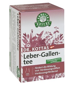 Dr. Kottas Leber-Gallentee ist ein Arzneitee mit den Wirkstoffen Kamillenblüten, Pfefferminzblätter, Tausendguldenkraut und Löwenzahnwurzel. Die Bitterstoffe des Tausendguldenkrauts und der Löwenzahnwurzel fördern die Bildung von Verdauungssäften. Die Kamillenblüten und die Pfefferminzblätter unterstützen den verdauungsfördernden Effekt. Dr.Kottas Leber-Gallentee ist ein traditionelles pflanzliches Arzneimittel zur Anwendung bei milden Verdauungsbeschwerden wie Völlegefühl und Blähungen. ART DER ANWENDUNG: Pro Tasse (125 ml) 1 Filterbeutel mit kochendem Wasser übergießen, 10 Minuten zugedeckt ziehen lassen. Danach Filterbeutel gut ausdrücken und den Tee lauwarm, schluckweise trinken. Der Tee kann nach Geschmack gesüßt werden. DOSIERUNG: Für Erwachsene und Jugendliche ab 12 Jahren: 2-3 mal täglich nach den Mahlzeiten 1 Tasse Tee Für Kinder von 6-12 Jahren: 1-2 mal täglich nach den Mahlzeiten 1 Tasse Tee