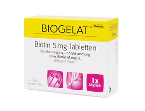 Biogelat Biotin 5 mg ist ein Vitaminpräparat. Biotin, auch als Vitamin B7 oder Vitamin H bezeichnet, ist ein wasserlösliches Vitamin und gehört zu den Vitaminen der B-Gruppe. Dieses Vitamin kann in der Darmflora gebildet und zusätzlich über die Nahrung aufgenommen werden. Es kommt im menschlichen Körper in verschiedenen Organen und Geweben vor. Biotin spielt eine wichtige Rolle bei Stoffwechselprozessen (Kohlehydrat-, Fett- und Eiweißstoffwechsel) Zur Vorbeugung und Therapie von Biotin-Mangelzuständen