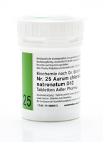 Aurum chloratum natronatum ist der Betriebsstoff der Zirbeldrüse und steuert die Melatonin-Produktion, daraus resultierend steuert er alle Rhythmen im Körper. Das Schüssler Salz Nr. 25 wird bei Jetlag und Einschlafstörungen eingenommen und unterstützt Menschen, die aus dem Rythmus sind.Die Nr. 25 ist ein wichtiges Frauenmittel, weil sie hormonelle Regelkreise in allen Lebensphasen regulierend unterstützt. Darüber hinaus steuert Aurum chloratum natronatum den Schlaf-Wach-Rhythmus und hilft z.B. Schicht-und Nachtarbeitern beim Einschlafen und älteren Menschen mit Einschlafproblemen.Zusätzlich wird durch das Schüssler Salz Nr. 25 die arterielle Durchblutung gefördert.Wirkung:Die Mineralstoffe nach Dr. Schüssler verstehen sich in ihrer Anwendung als Regulationstherapie, bestens geeignet zur Gesundheitspflege und Vorbeugung von Krankheiten, bzw. zur Begleitung oder Unterstützung einer ärztlichen Therapie, ganz im Sinne einer komplementärmedizinischen Anwendung. Dr. Schüssler unterscheidet zwischen Betriebsstoffen (Funktionsmittel in den Zellen) und Baustoffen, die für den Aufbau des Körpers nötig sind.Die Mineralstoffe sind so verdünnt, dass sie auf direktem Weg über die Mundschleimhaut in Gewebe und Blut aufgenommen werden. Schüssler Salze sind homöopathisch zubereitete, potenzierte Arzneimittel hoher Qualität, die dem Körper wegen eines Mangels an Betriebsstoffen (Funktionsmitteln) in den Zellen zugeführt werden.Anwendung:Die Anwendung ergibt sich aus den beschriebenen Funktionen der Mineralstoffe. Tabletten im Mund zergehen lassen oder portionsweise über den Tag verteilt in Wasser lösen und schlückchenweise einnehmen. Die Dosierung richtet sich nach der Stärke des Bedarfs.Besondere Hinweise:Bereits ab dem Säuglingsalter anwendbar.Produktinfo