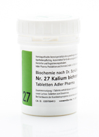 Kalium bichromicum wird zur regulierenden Begleitung des Cholesterinstoffwechsels eingesetzt. Es fördert und unterstützt die Kohlenhydratverwertung und wird bei Stress und starker sportlicher Betätigung empfohlen, da es hier zu erhöhten Chromverlusten kommt.Die Nr. 27 hat durch die Regulierung des Cholesterins einen großen Stellenwert in der Arteriosklerose-Vorbeugung. Sie beeinflusst den Hunger-Sättigungs-Mechanismus und fördert somit die Gewichtsabnahme. Auch bei Neigung zu Akne wird die Nr. 27 empfohlen, da sie den Fettstoffwechsel steuert.Wirkung:Die Mineralstoffe nach Dr. Schüssler verstehen sich in ihrer Anwendung als Regulationstherapie, bestens geeignet zur Gesundheitspflege und Vorbeugung von Krankheiten, bzw. zur Begleitung oder Unterstützung einer ärztlichen Therapie, ganz im Sinne einer komplementärmedizinischen Anwendung. Dr. Schüssler unterscheidet zwischen Betriebsstoffen (Funktionsmittel in den Zellen) und Baustoffen, die für den Aufbau des Körpers nötig sind.Die Mineralstoffe sind so verdünnt, dass sie auf direktem Weg über die Mundschleimhaut in Gewebe und Blut aufgenommen werden. Schüssler Salze sind homöopathisch zubereitete, potenzierte Arzneimittel hoher Qualität, die dem Körper wegen eines Mangels an Betriebsstoffen (Funktionsmitteln) in den Zellen zugeführt werden.Anwendung:Die Anwendung ergibt sich aus den beschriebenen Funktionen der Mineralstoffe. Tabletten im Mund zergehen lassen oder portionsweise über den Tag verteilt in Wasser lösen und schlückchenweise einnehmen. Die Dosierung richtet sich nach der Stärke des Bedarfs.Besondere Hinweise:Bereits ab dem Säuglingsalter anwendbar.Produktinfo