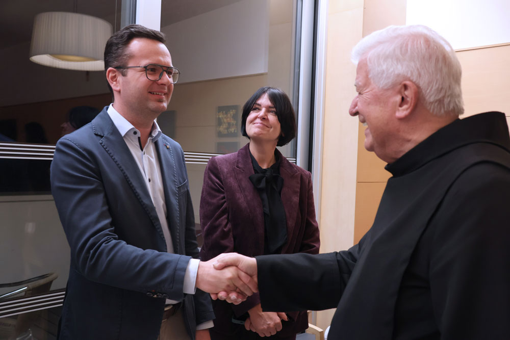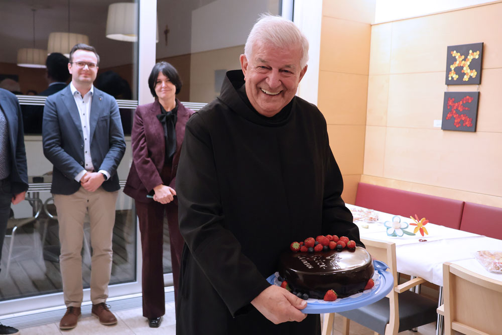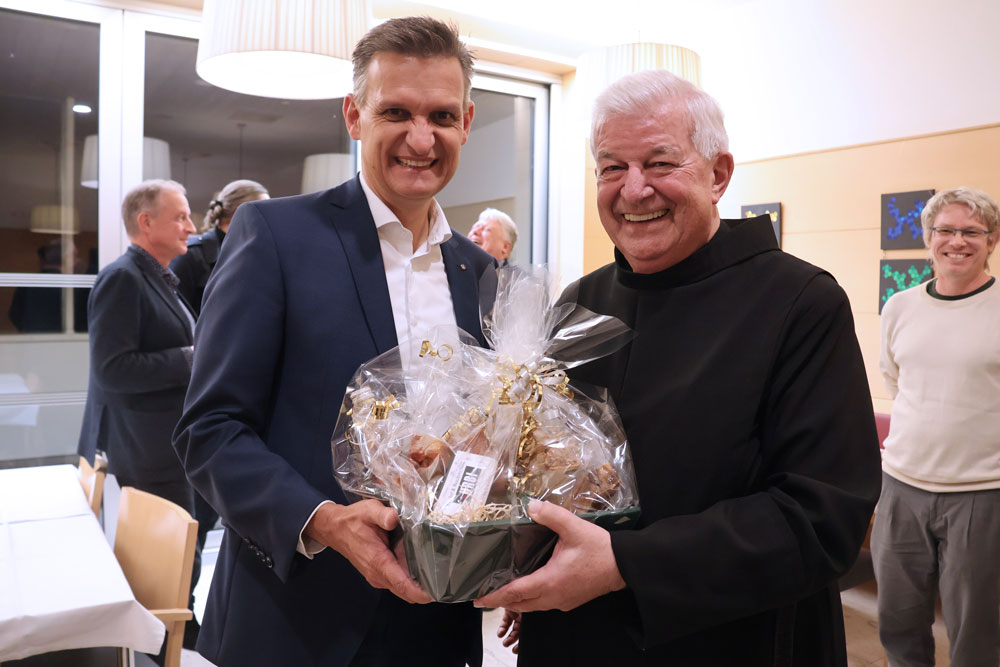 Nach seiner Rückkehr von der feierlichen Verleihung wurde Frater Paulus am Abend herzlich in den Lebenswelten Steiermark empfangen. Die Mitglieder der Kollegialen Führung sowie einige aktive und ehemalige Mitarbeitende hießen ihn willkommen, gratulierten und feierten mit ihm gemeinsam. Gesamtleiter Mag. Frank Prassl, MBA überreichte ihm eine kleine Aufmerksamkeit als Zeichen der Wertschätzung.