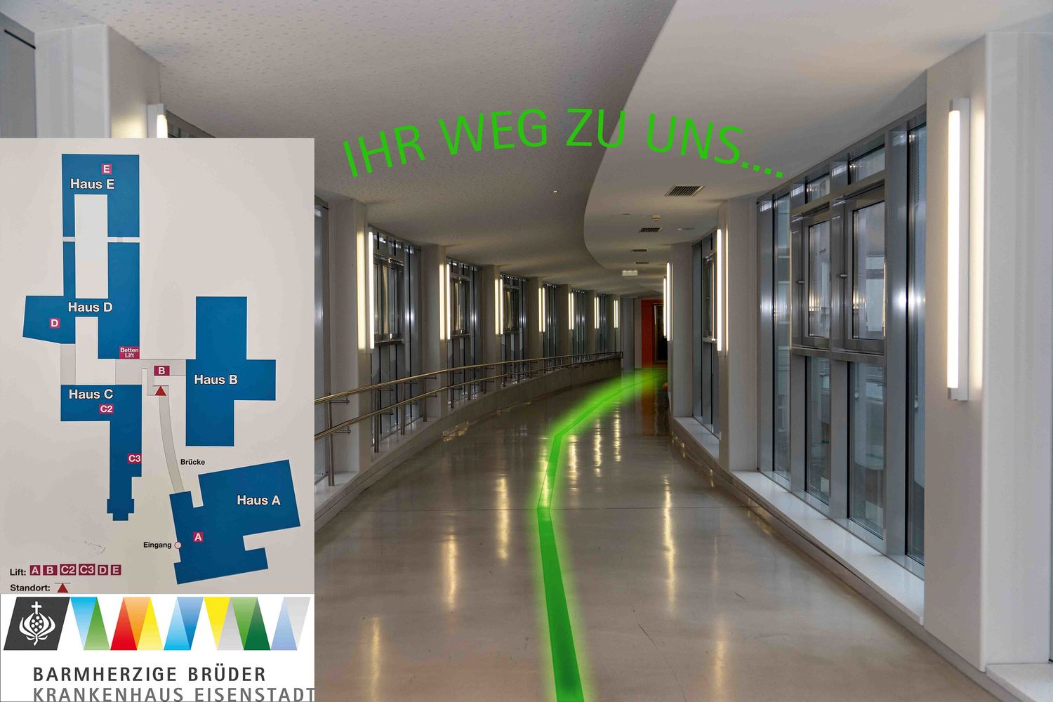 Die Station C5.1 befindet sich im Haus C auf den Ebenen 4, 5 und 6. Gehen Sie den Verbindungsgang, der vom Portier wegführt, auf Ebene 0 entlang. Am Ende des Ganges biegen Sie links in das Haus C ab. Benutzen Sie den Lift C3 und fahren Sie auf die Ebene 4, 5 oder 6.