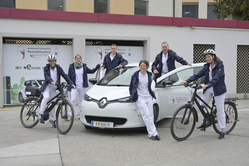 Damit die TherapeutInnen die Hausbesuche klimafreundlich absolvieren können, wurden drei E-Fahrzeuge sowie zwei E- Bikes angekauft und die entsprechende Infrastruktur dafür geschaffen (Lademöglichkeiten.