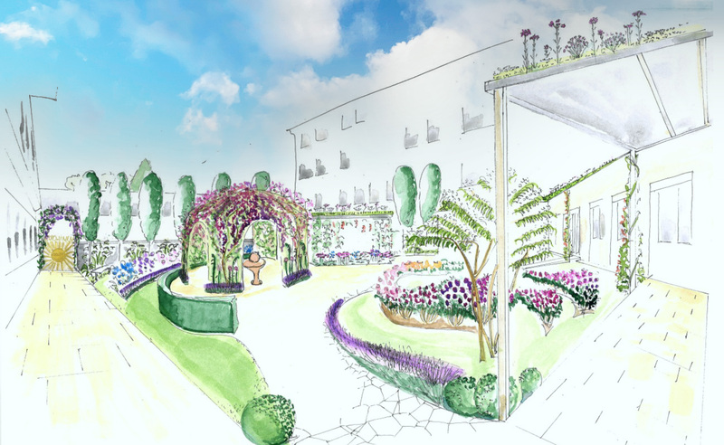 Wie in der Skizze ersichtlich, ist der Garten durch eine Reihe von Gartenarchitektonischen Merkmalen charakterisiert. Die Wetterbedingungen der letzten Wochen haben leider die Fortschritte ein wenig beeinträchtigt. Auf der Skizze ist die neue Struktur des Gartens zu sehen. Die Eudaimonia, das Glück, ist eine innere Haltung, die ihre Freudigkeit aus der seelischen Harmonie und aus dem Bewusstsein schöpft, eine Bestimmung zu erfüllen. Ein Sinn, der das Leben zum Guten führt. Aus SALUTOGENESE. Die Wirkebene ist demnach die Herzebene. Im Weiteren wird der Rosengarten der Freude der Hl. Elisabeth v. Thüringen gewidmet. Denn auch Elisabeth hat unter der Aufrechterhaltung der Gesundheit mehr gesehen, als „nur“ den Körper gesund zu halten. Es ging ihr auch um das Seelenwohl. Darüber hinaus wird die Freude in der Musik im Rosengarten meist in den Tonarten G, F, Fis, E, D und C-Dur zum Ausdruck gebracht. Der Rosengarten ist ausgestaltet mit bestimmten Farben, wie Rot, Magenta und Violett, die im Vordergrund stehen während andere wie Blau und Grün eher im Hintergrund bleiben.