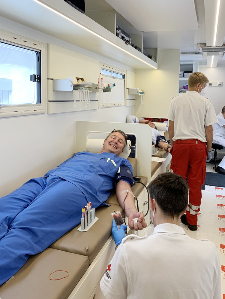 Auf Initiative des Elisabethinen-Krankenhauses Klagenfurt eine betriebsinterne Blutspendeaktion durchgeführt. Dazu machte der Blutspendenbus des Roten Kreuzes im Innenhof des Krankenhauses Station, wo Primarius Dr. Sima mit seinem engagierten Team die Spenden vom „Saft des Lebens“ abnahm.
