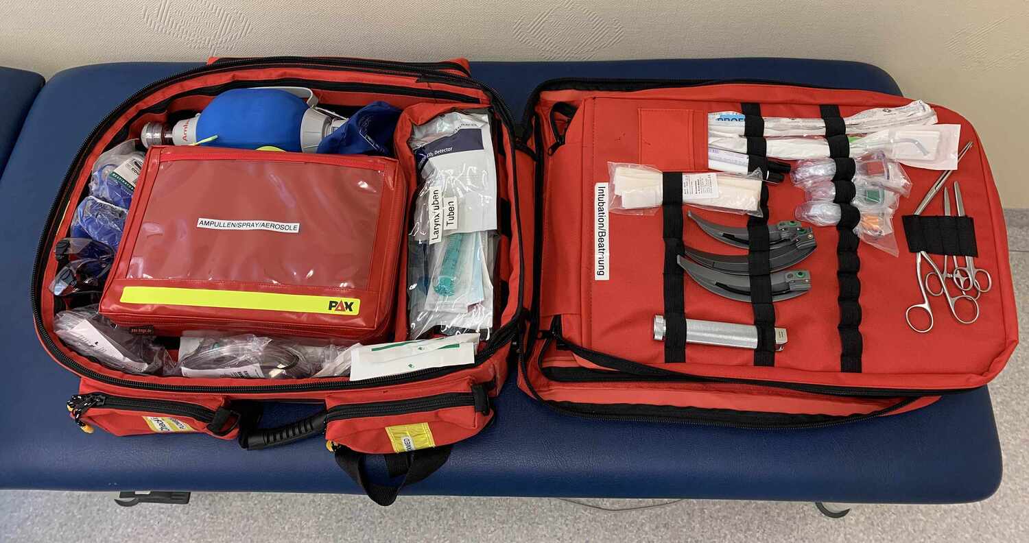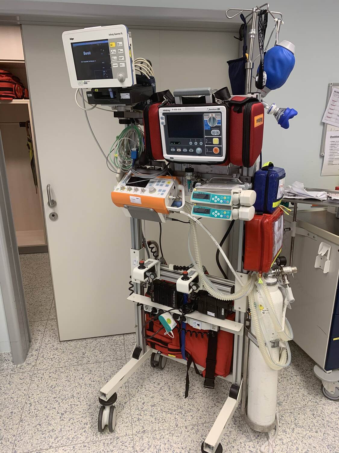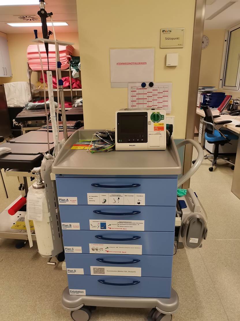Da Notfälle eher seltene Ereignisse sind und der Umgang mit dem Notfallequipment nicht zur täglichen Routine zählt, ist regelmäßiges Training mit dem Original-Equipment unumgänglich. Alle Notfallwägen, Notfallrucksäcke und MobiDocs (Wägen auf denen Monitoring und div. med. Equipment transportabel verortet sind) sind in den Grazer Häusern weitgehend identisch bestückt und es befinden sich auch im Simulationszentrum jeweils ein Notfallwagen, ein Rucksack sowie ein (nachgebautes) Mobidoc.