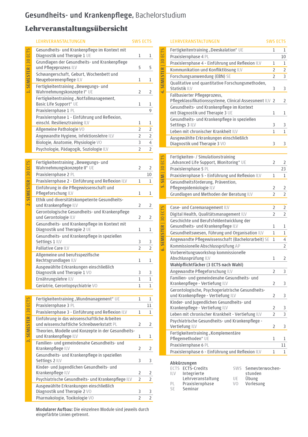 Die Gesamtdauer der theoretischen und praktischen Ausbildung im Bachelorstudium Gesundheits- und Krankenpflege hat ein Stundenausmaß von mindestens 4600 Stunden (180 ECTS). Die Studiendauer ist auf 6 Semester ausgelegt und ist als Vollzeitstudium organisiert.