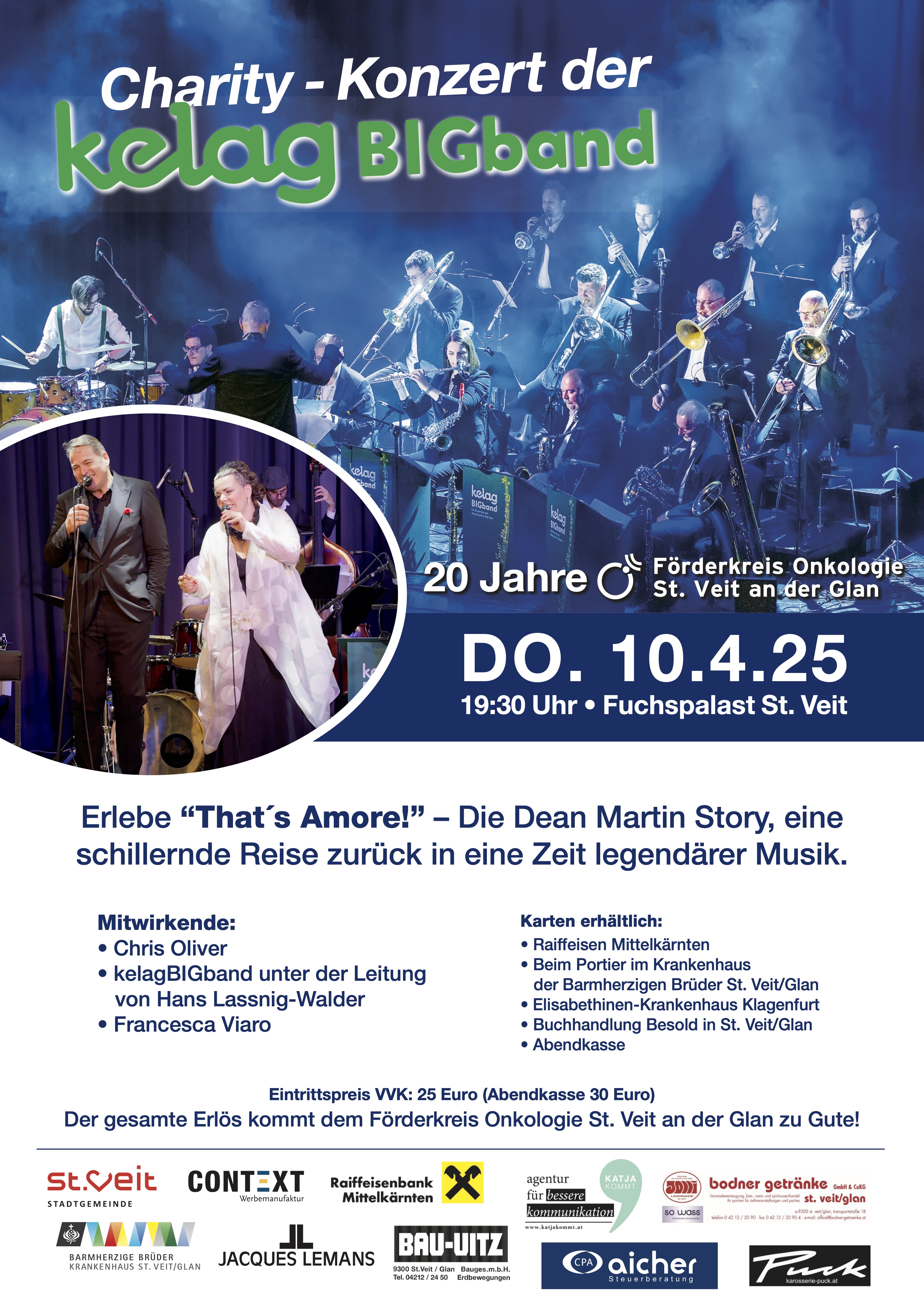 Unter dem Titel „That’s Amore – Die Dean Martin Story“ erwartet die Besucher:innen ein unvergesslicher Abend, der im Zeichen des Wohltätigen steht. Die Veranstaltung findet zugunsten des „Förderkreises Onkologie St. Veit/Glan“ statt, der die Behandlung von Krebserkrankten am Krankenhaus der Barmherzigen Brüder St. Veit/Glan in vielfältiger Weise unterstützt.