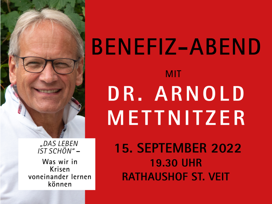 Benefizabend mit Dr. Arnold Mettnitzer am 15. September 2022 um 19:30 Uhr im Rathaushof in St. Veit an der Glan zugunsten des Förderkreises Onkologie St. Veit/Glan.