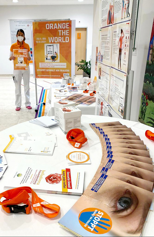 Die Opferschutzgruppe des Krankenhauses St. Veit und des Elisabethinen-Krankenhauses Klagenfurt lenken rund um die 16 Tage mit knallorangen Plakaten, Buttons, Foldern, Flyern und Videos die Aufmerksamkeit auf dieses wichtige Thema.