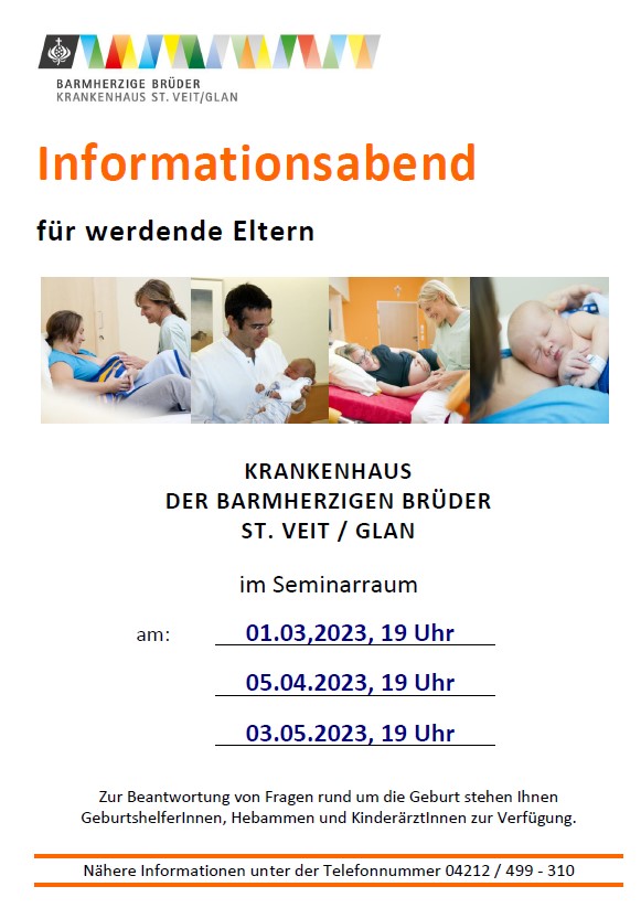 In einem kurzen Vortrag erfahrt ihr alles Wichtige zur Geburt am Krankenhaus der Barmherzigen Brüder St. Veit/Glan. Auch unsere Angebote, die bereits vor der Entbindung in Anspruch genommen werden können (Hebammensprechstunde u. ä.), werden vorgestellt. Unsere leitenden Kreißsaal-Ärzte und erfahrene Hebammen führen durch den Abend und beantworten eure Fragen.
