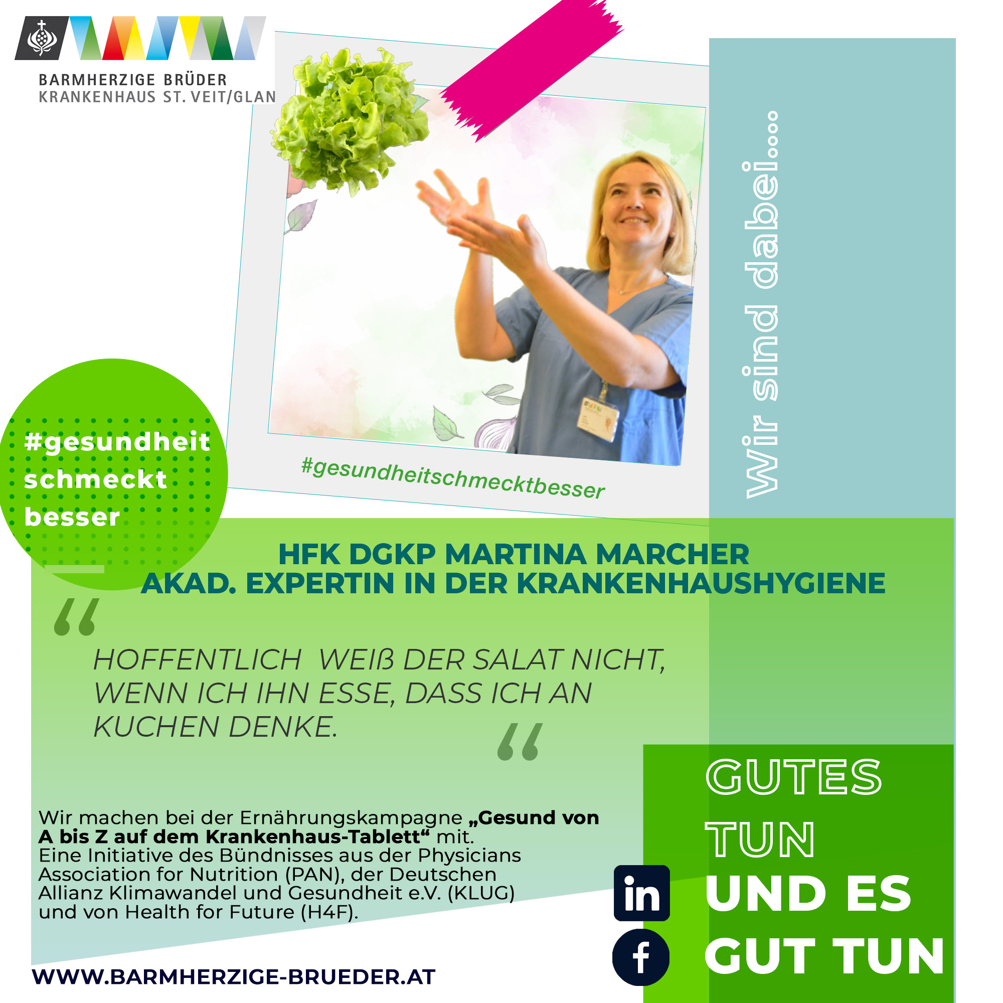 Unsere Hygienefachkraft DGKP Martina Marcher wirbelt den Salatkopf nur so in der Luft herum und hat dabei auch noch einen coolen Spruch auf Lager: