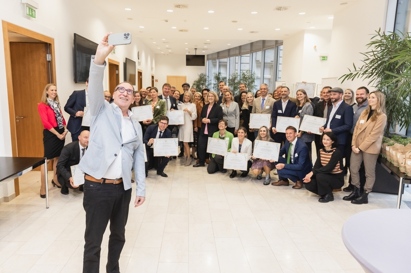 Bundesminister Johannes Rauch überreichte die Auszeichnungen an insgesamt 18 Gesundheits- und Pflegeeinrichtungen, die mit ihren praxisnahen Projekten in den Bereichen Gebäude und Energie, Grünraum, Mobilität, Ernährung, Ressourcen- und Abfallmanagement sowie Kommunikation überzeugen.