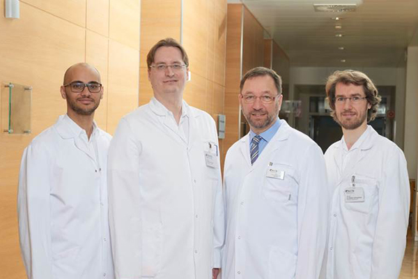 Von links nach rechts: OA Dr. Mario Kneifl, F.E.B.O.; Prim. Dr. Peter Reinelt F.E.B.O; Prim. Univ.-Prof. DDr. Ulrich Schönherr, F.E.B.O.; OA Dr. Balazs Gyöngyössy, F.E.B.O.